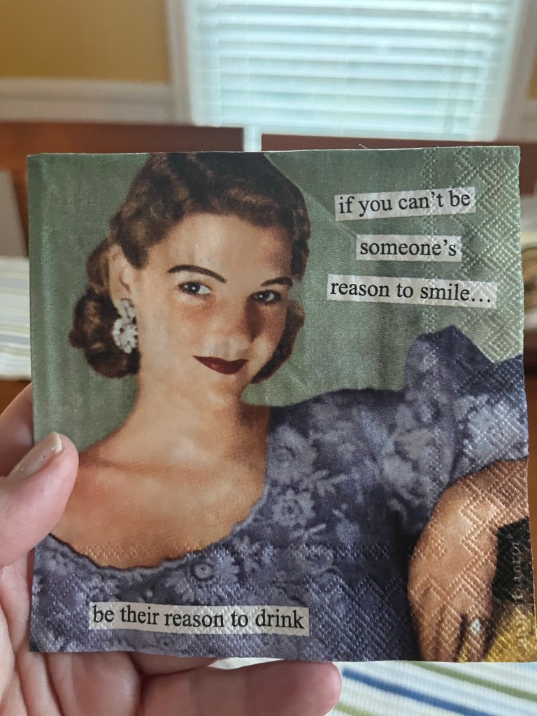 Her grandmother called her “Barefoot Bessie”. We used the napkins my mom gave me for Christmas: