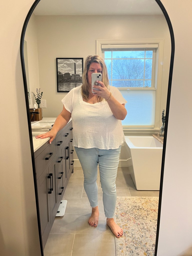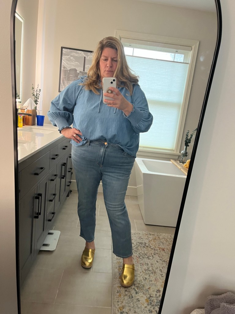 I think you did great! I love all your ON tops. I ordered a tunic zip pullover from Shop Style your senses and they sent me gold hoops as a thank you. Hadley has already jacked them from me 😂 I looked on target app and can’t find those jeans…😢