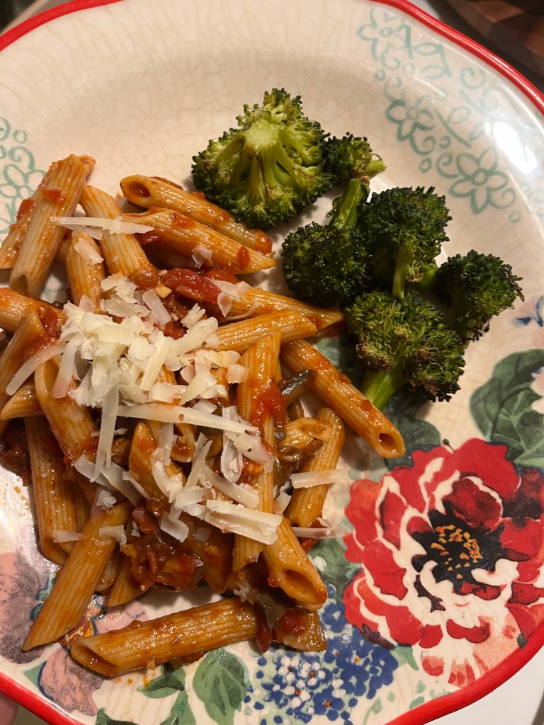 My dinners this week were good ones. One night it was the bacon and tomato whole wheat pasta again wtih broccoli: