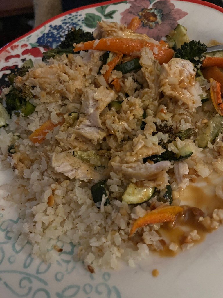And, one night I made Thai peanut sauce with crunchy peanut butter atop cauliflower rice, chicken and vegetables: