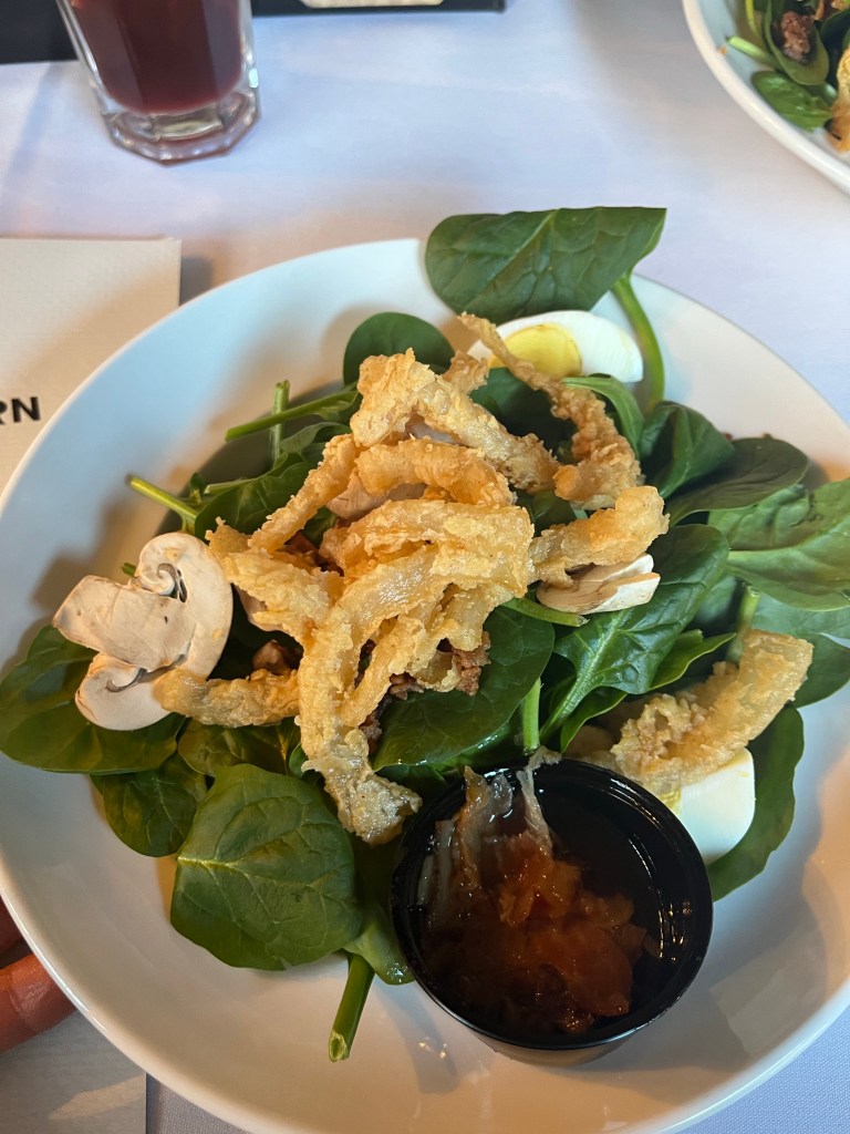 Tom and I both ordered the spinach salad with hot bacon dressing and fried onion straws. If there is a hot bacon spinach salad on a menu, you better believe both of us want that! We should have split it because it was really big.