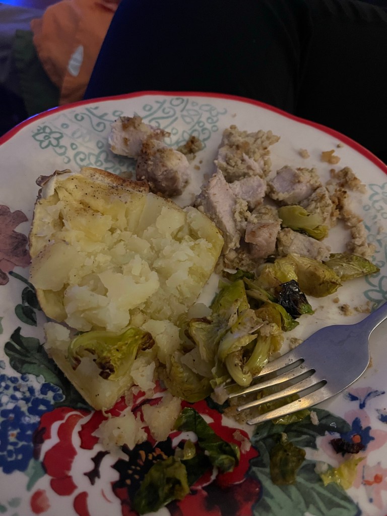For V Day dinner on Tuesday night, I made pork chops, brussel sprouts, and a sweet potato that turned out to be white inside and had the best flavor!