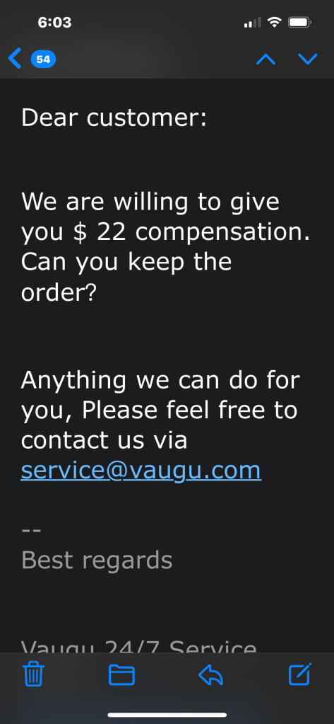 Vaugu – I succumbed to a Facebook or Instagram ad. I ordered the above shirt and two dresses. They were each around $30, bringing my order to about $108 including shipping. The order took 31 days to arrive. The sizing was off and the material was flimsy, slimy, and tragic. I immediately emailed their contact – I could not find a phone number.