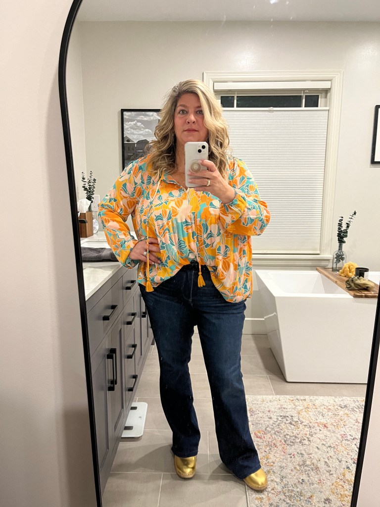I wore my new TJ Maxx blouse – it just makes me happy to look at these colors in my closet – with my Wit and Wisdom baby flares that I ordered from Nordstrom back in the fall. I feel great in these jeans. They are a bit snug in the waist, but not uncomfortably so. I wore them with my gold clogs to start the day and changed into sneakers later on because I was proctoring a test and wanted to be quiet.