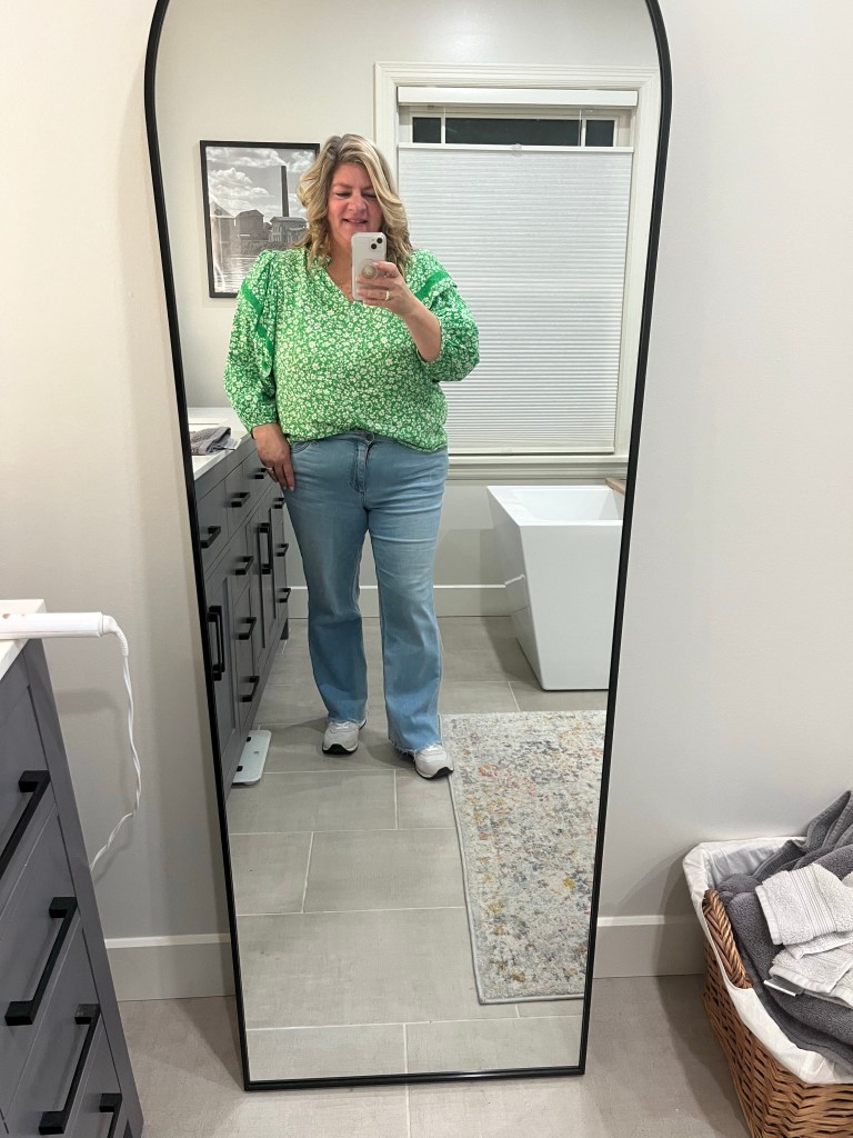 Thursday I wore my last year’s Target blouse that is floral but almost looks like little shamrocks. I wore my consignment Kut from the Kloth jeans with sneakers. I know this would have looked better with a clog or sandal with some height. Also, notice the difference between the dark and light jean. I think the dark looks much more flattering. Again, I was proctoring so I had to wear quiet shoes.