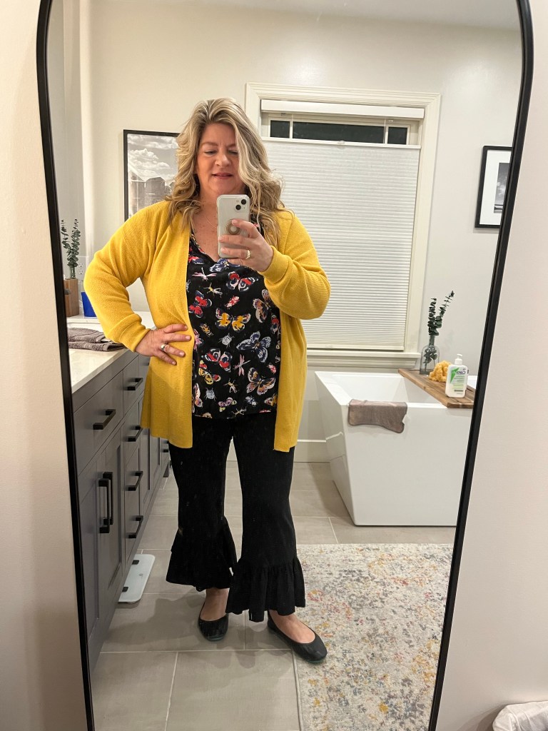 I wore this old Old Navy butterfly blouse that I love with my yellow sweater and Matilda Janes. I can’t seem to have the right black spring shoes to wear with something like this. I have to reach for my black Tieks but I wish I had something different. Footwear for teaching is really tricky.