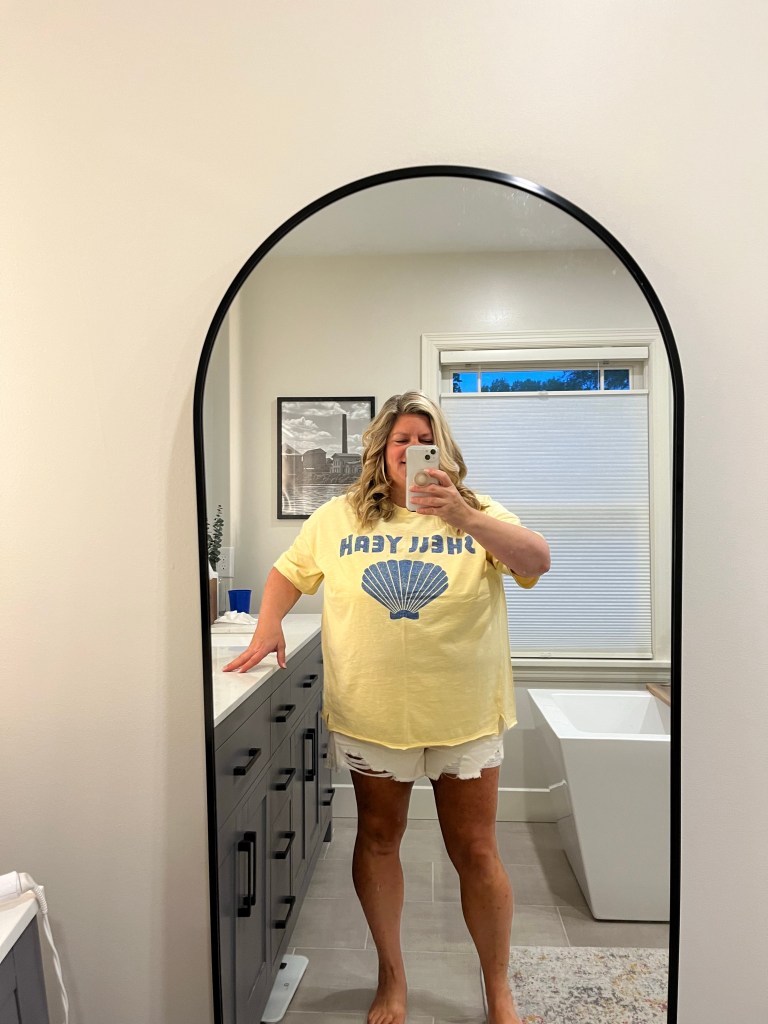 I got this “Shell Yeah” t-shirt that I thought was funny and I am trying it on with the original reason for my order – cream denim cut offs. I thought cream would be great to have. they have elastic in the back just like toddler shorts. Yippee!