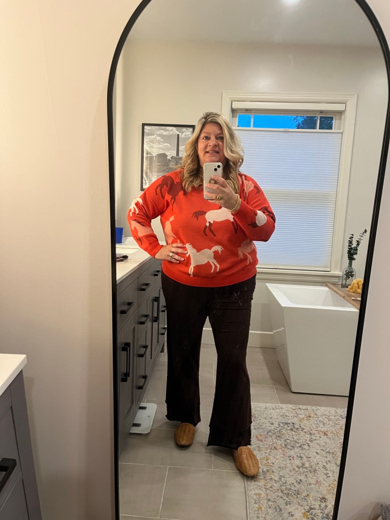 Monday for school it turned cold again – imagine that! I wore my horse sweater (another opportunity!), Matilda Jane pants that matched one of the horses – yay!, and my Olukai mules.