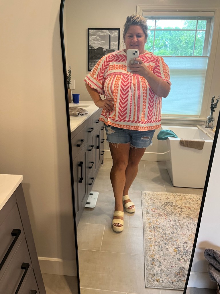 I ordered a couple of sizes but I am keeping all 3 colors you guys! This will also work into the fall and I just love the pattern. My friend Heather agreed with me that it very much looks like a boutique blouse that would cost upwards of $60. Guess what – by ordering online and using whatever code they had going on my tops were $11.97 each!