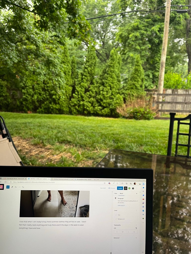 Monday morning was rainy and one of my favorite types of summer mornings. I took my stuff out to my covered patio and did my quiet time, my blog reading and blog writing there.