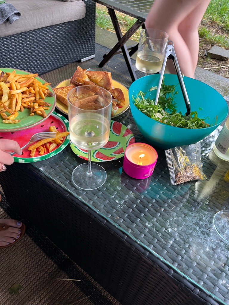 The rain kept up off and on all day and did change my plans for a pool day with Elizabeth who was off for Juneteenth. We pivoted and she came over for bougie grilled cheese and white wine. And, Erica was able to join us because something got cancelled. It was so fun and felt so summer and carefree! One of my goals was to have people over, so this was great!