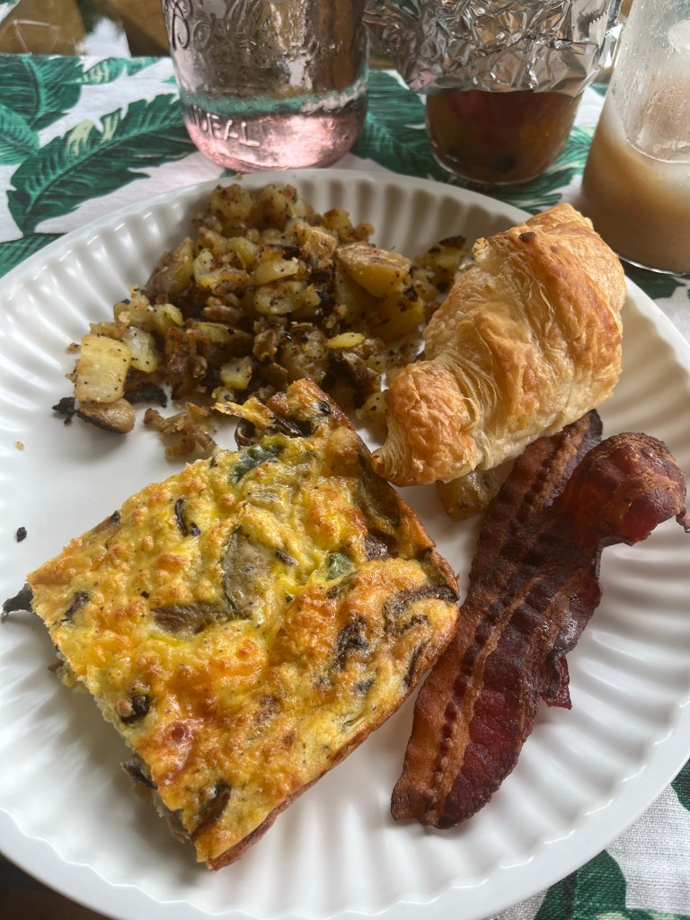 We had an egg bake with a bunch of vegetables, everything potatoes, Trader Joe’s mini croissants, bacon, and…