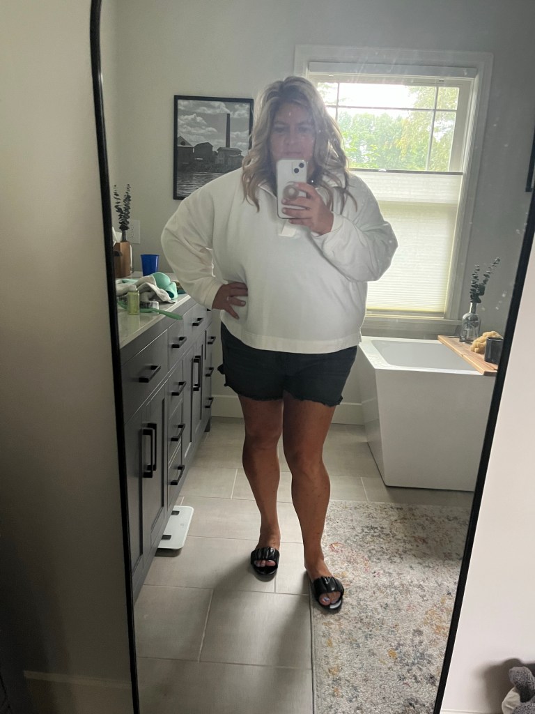 Later that afternoon for the movie, I changed into my black cut offs and my white polo sweatshirt with my new J. Crew Factory sandals. Dang, the sandals must run narrow. I think they would not work for anyone with a bit wider foot. I really like the look, though!