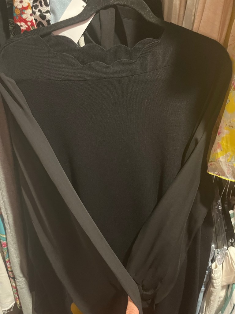 This top I picked up on a whim in TJ Maxx. It is in the photo above with the Spanx leggings. The sleeves are sheer and the middle is like a thin sweater. I love the scalloped detail at the neck and I think a higher neck can be more flattering on a large chest. I can’t believe how much I reached for this top last winter.