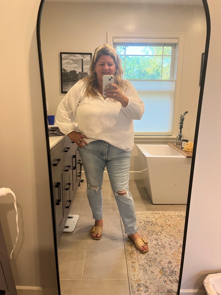 Let’s go back to last week when the weather was unseasonably cool. I wore this to one of our teacher workdays. This outfit is sponsored by Old Navy – ha! The white gauzy blouse is a consignment find – Old Navy new with tags – you have seen it on here a bunch. The jeans are from my quest last fall to try a straight leg. They are button fly which surprised me in a good way! As you can see the length is perfect. As you can see, they are tight, so I am trying to get back to where they fit a bit looser.