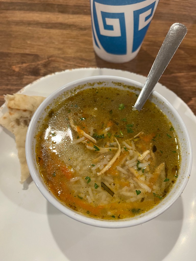 We didn’t buy anything else and by that time Tom was back in town so he met us for dinner at Tatziki’s. I wasn’t very hungry and just had a bowl of lemon orzo soup: