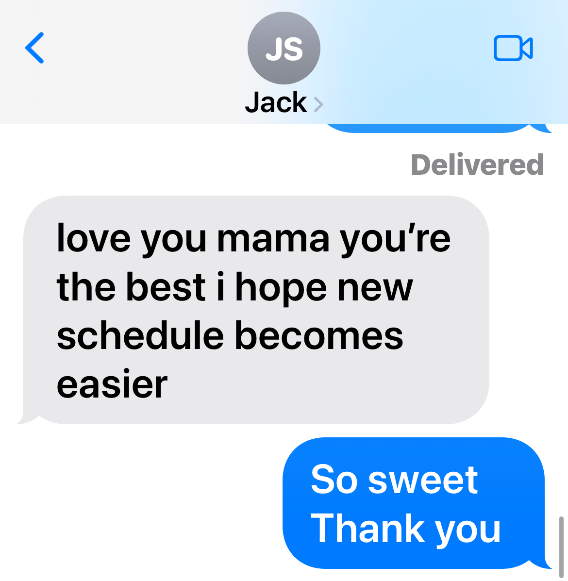 I’m also seeing sweet texts from Jack. My kids didn’t get a phone until sophomore year of high school, by the way. We had a pay as you go phone at home when they were home alone but it wasn’t a smart phone and it didn’t leave the house.