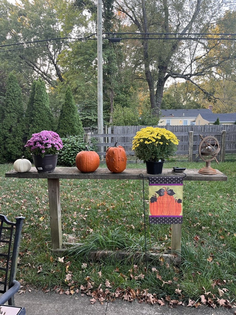 I love looking at my new pumpkins and mums. I got one pumpkin with a bunch of bumps on it and I love it!