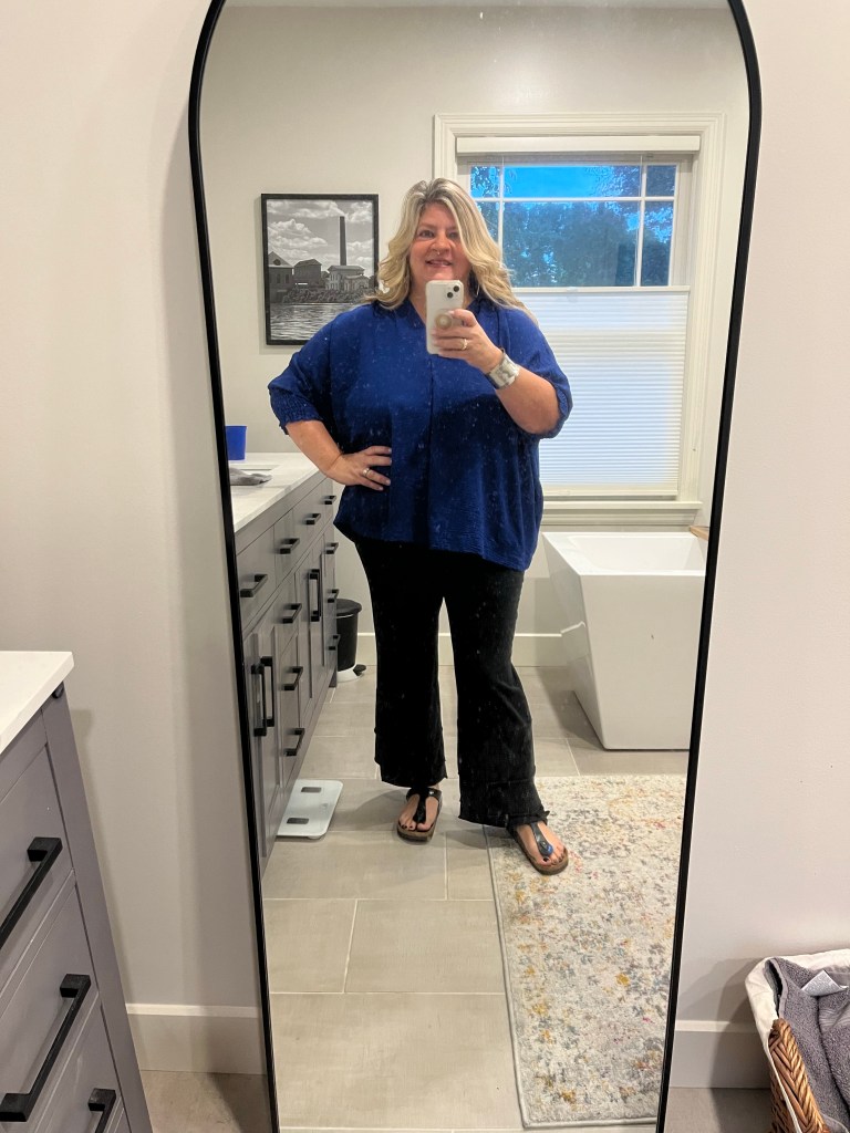 This is a new blue top that I was kind of on the fence about. It is from a local boutique called Darling State of Mind and it’s one of my favorite brands Umgee. I liked the color and it’s UK blue and I liked the style. This is a bad photo and I hope it looks ok. I did change shoes to closed toe.