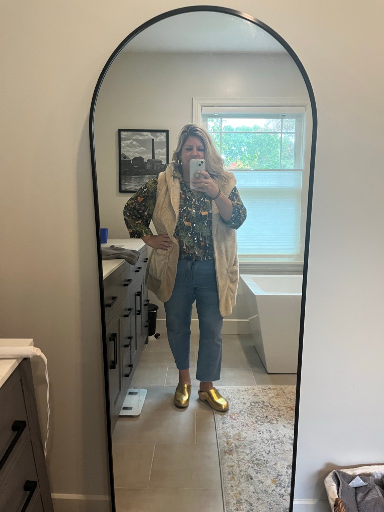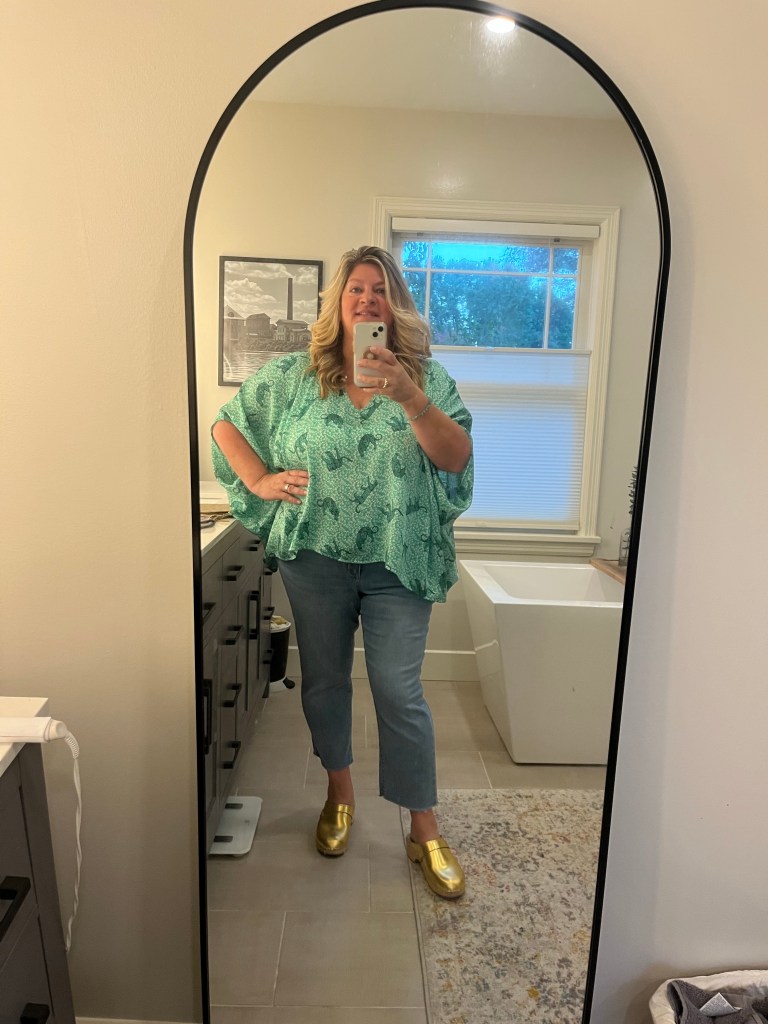 There we go – I cleaned my mirror. I wore this Friday to school because it was Friday and I felt celebratory. I made it through the first week back! I am wearing my Target Universal Thread straight leg jeans in short, my cougar? poncho silk top, and my gold clogs.