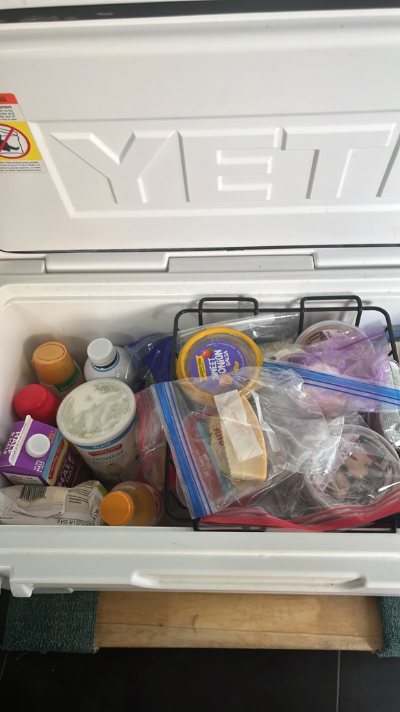 I am hoping I am on my last days living out of a cooler. Wednesday is the big day. I learned I can do this, but it’s not fun. Tom has re-stocked the ice and made things fit and we have worked together. I am tossing some things today that have hung around the cooler for too long. It’s going to be so nice to have a brand new refrigerator and I’m looking forward to organizing things! Should I buy some acrylic baskets for the fridge?
