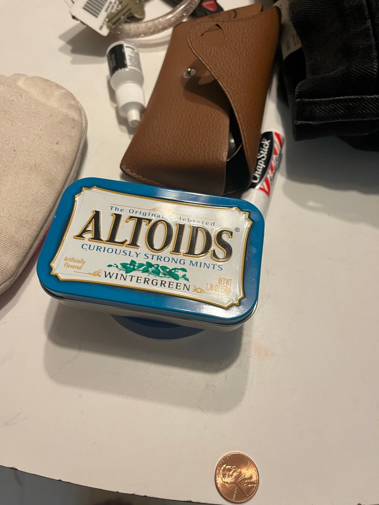 Speaking of pennies, I laid out all of the things I needed to put in my small purse when attending my best friend’s dad’s funeral. I was careful to place them on a space on the table where nothing else was. I brought my small purse from my closet to the table and look what was there: