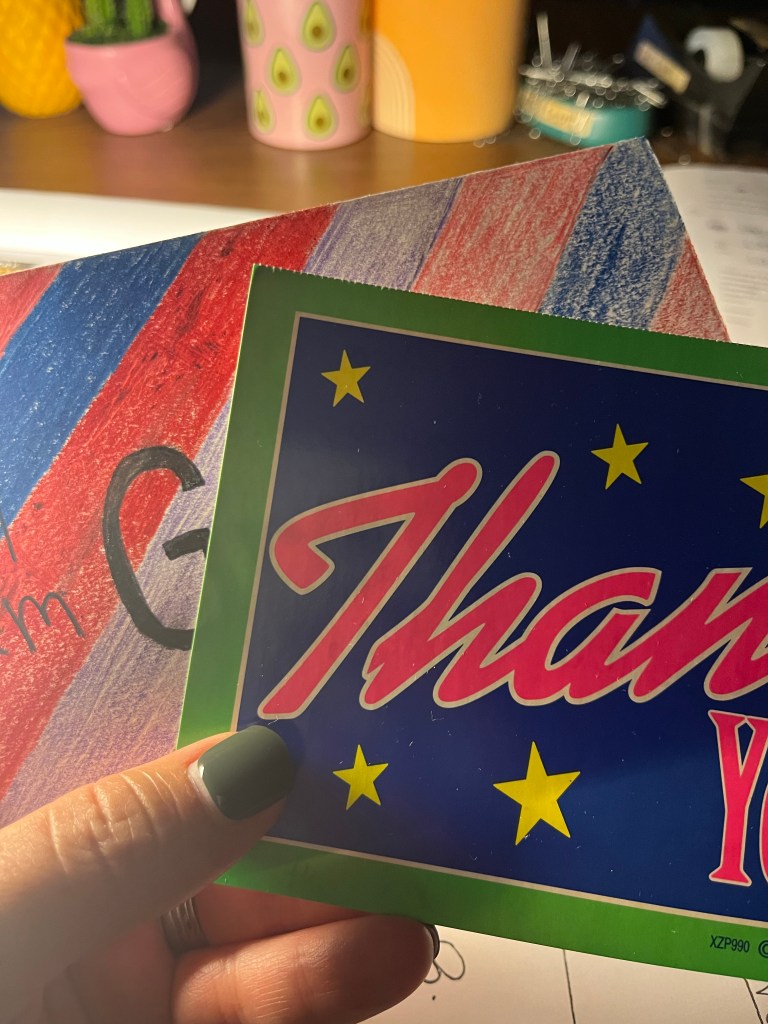 A few teachers had kids write thank you notes and I was touched: