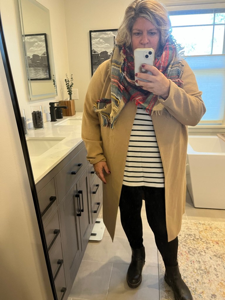 I wore my athletic pocketed leggings, a black short sleeve tee, a striped long sleeve over that, my camel coatigan, a blanket scarf, and my Chelsea boots. I ended up in just the short sleeved tee for most of the travel to and from on the plane because I tend to run hot.