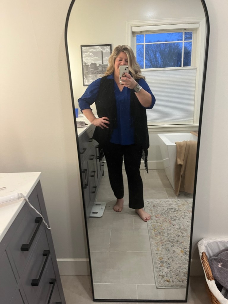 Blue: I love my vest and my Wit and Wisdom dress pants but the blue blouse underneath has a really thick elastic on the arms and it bothered me all day. I did wear shoes, by the way!
