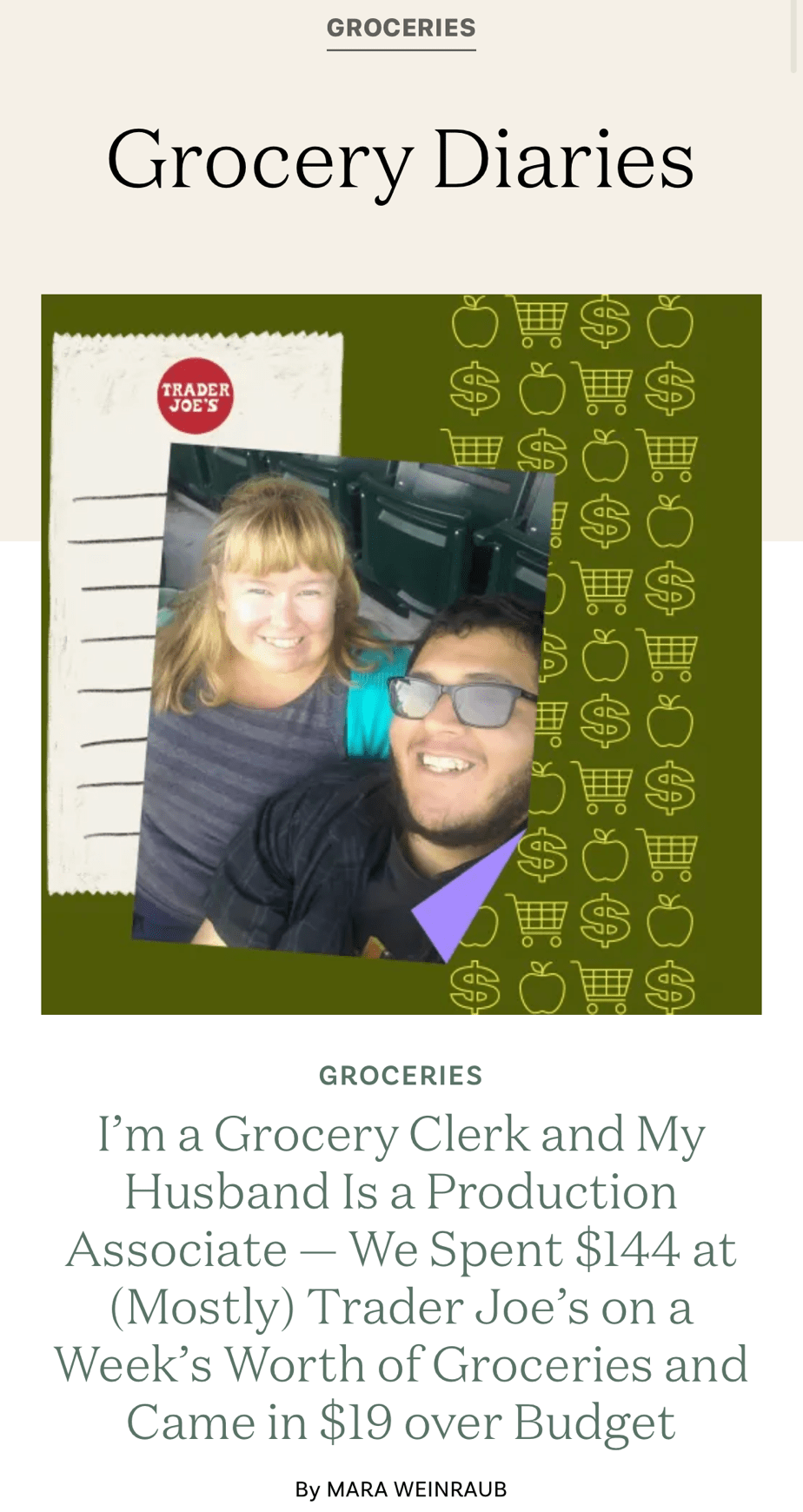 They have a Grocery Diaries series that I really like reading. People say where they shop, list what they bought, and give you a week’s run down of the meals they made and ate.