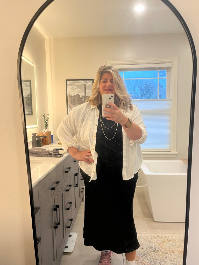 So, I tried a lewk above with my black Target silk skirt, my black Target muscle tee, and a white button down. I wore my Adidas Gazelles with a higher white ankle sock. I was super comfortable, but I’m on the fence about the outfit.