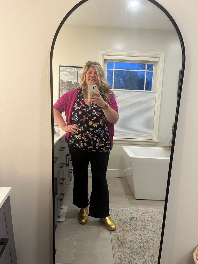 For school Monday, I wore my really, really old Old Navy butterfly blouse, a consignment magenta cardigan, my Matilda Jane Fin flares, and my gold clogs. I changed into my white leather Madewells sneaks after two periods. Lol!