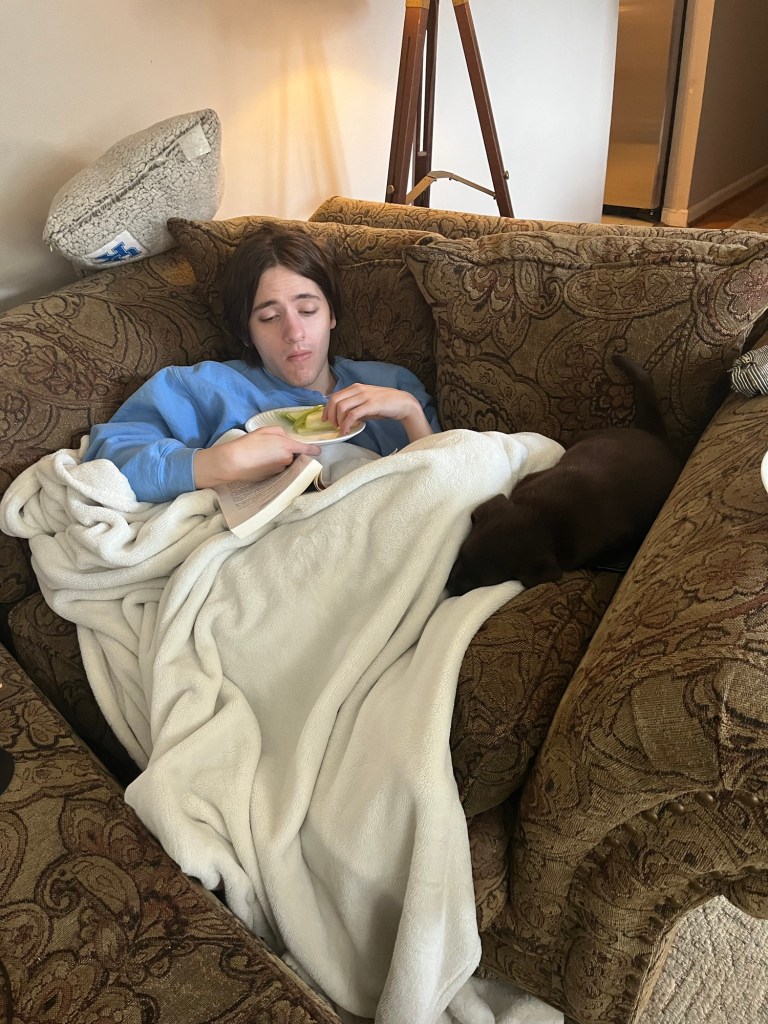 So, I take Eddie Otis out at 6:15 and then we do his breakfast. He doesn’t want to eat right away but he is so thirsty. I should say he has giardia, unfortunately. It is a parasite and we have had to give him powder on his food and a little pill. This could be affecting his thirst levels, his eating, and his bathroom business. We are hoping to get rid of it ASAP.
