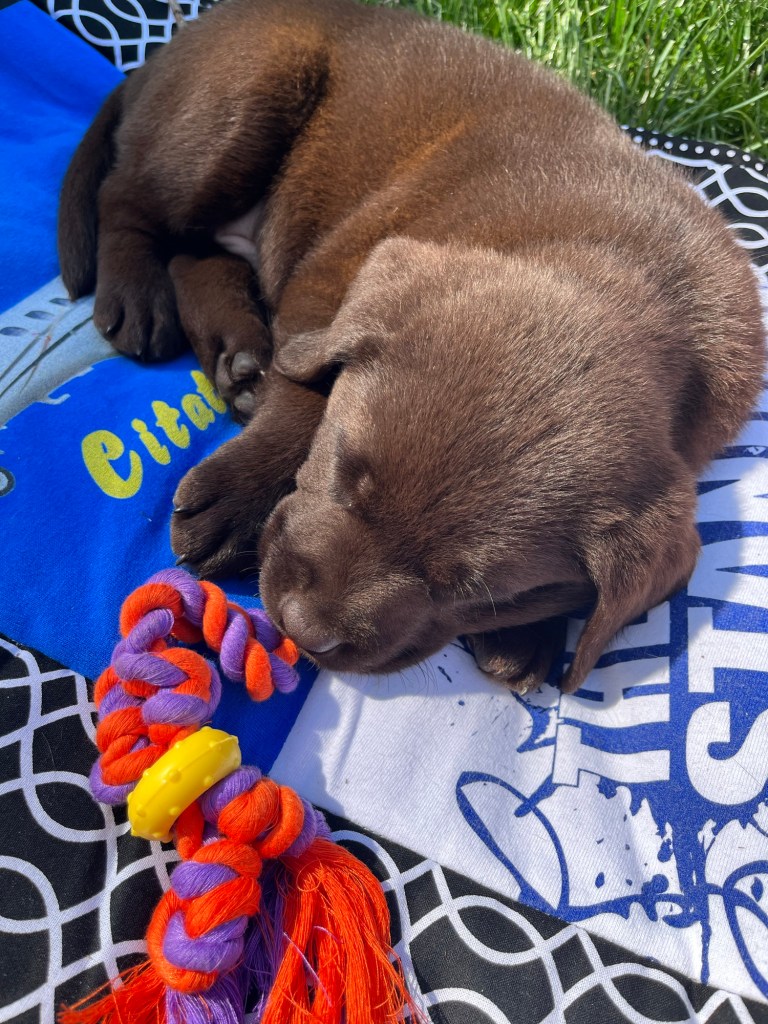 His little face is just so precious! I always forget about how much puppies sleep. Sorry to hear he has a parasite; I’m sure with the meds he will be well soon, though. We had a dog with worms when she was a puppy (my son Graham’s dog, Oakley), and she also had UTIs several times, but the worms finally went away and so did her propensity to get an infection. It seems like the little guy is adjusting and that you both have a good grasp on his training!