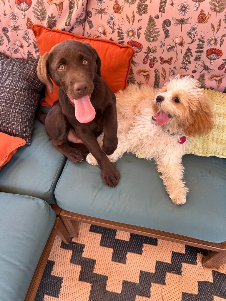 I’m also looking forward to Eddie Otis and Luna’s next playdate. My friend Victoria got Luna the same weekend we got EO. They had a big time Monday at lunch. Look at Victoria’s darling fabric for her outdoor couch cushions that she sewed herself!