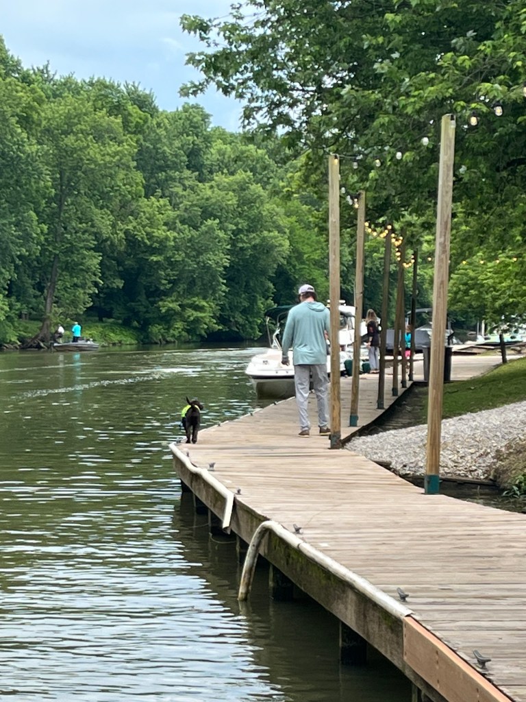 Tom is letting him do his thing on the dock and he is so close to the water. When we arrive at this restaurant on the water, EO gets off the boat to go do his business.