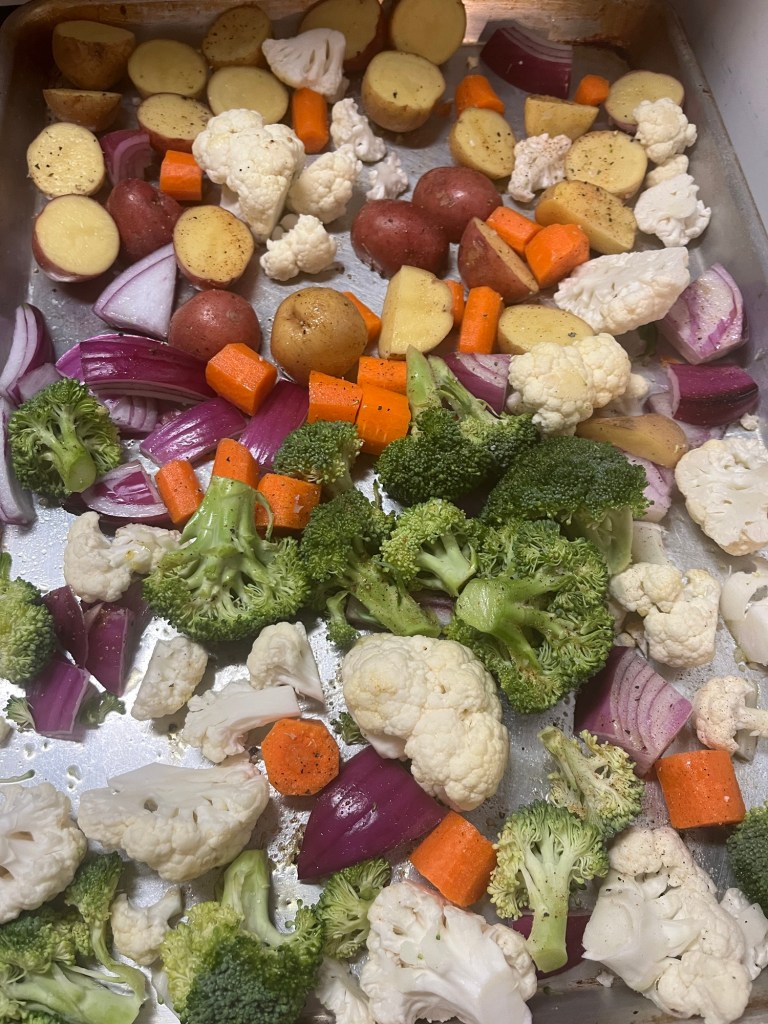 I am looking forward to roasting more vegetables. These turned out so darn good. My secret is high heat and not to crowd your sheet pan. I did EVOO, salt, pepper, cajun seasoning, and, garlic powder. I broiled for the last few minutes. I served this with chicken sausage and quinoa and made a simple dressing of EVOO, red wine vinegar, dijon mustard, and garlic, salt, and pepper. Looking to eat more plant based and more healthy grains.