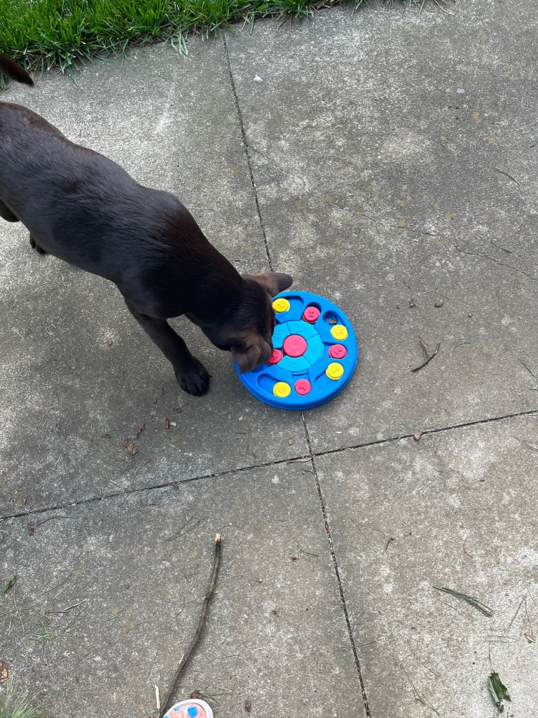 I’m also enjoying watching EO work his second dog puzzle. You put treats in the little compartments and he has to find them. He really loves working puzzles! He is very motivated by treats! Ha!