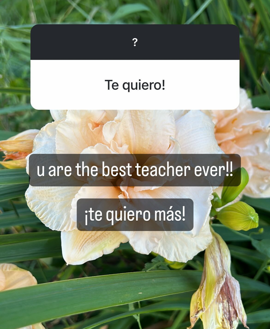 In the last few years, I have lots of students who freely say “Te quiero” (I love you) in notes to me or in passing. I think it’s super sweet. I have one girl who put a question box and I just said this to her. Look at her sweet reply: