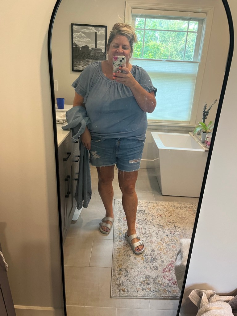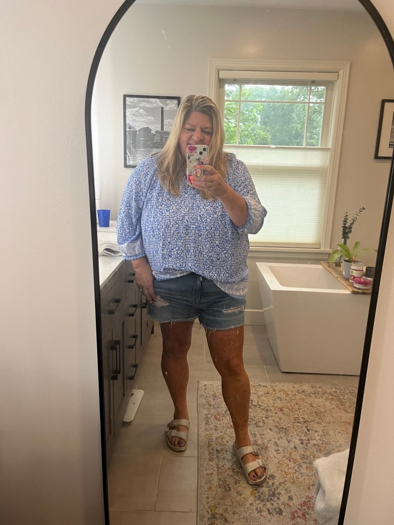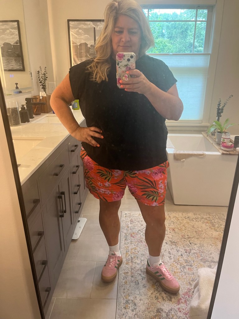 4. Cute outfits! I l love the new TJ Maxx blouse and your cutoffs. I have a purple and white small floral from BR that is similar. I tried on similar Adidas sneakers, w/o platform, and found them really uncomfortable. I sent back Hokas and On sneakers as well. I’m in between 9.5 and 10, so too small or too big? Which is worse? 😃My first day of PD is Monday, and I’m sad. Sad that summer went so fast but also sad that I accomplished so little. Today I spent 2.5 hours on the phone with retirement specialists. They will definitely need a stiff drink tonight, lol. I definitely understand retirement much better now., and they kindly answered my many questions. I have not purged or organized my closet or drawers. My master closet is scary, but we have very little storage. I don’t do summer well, I think. I’ve gotten into the habit of reading until 2AM or later! I get more accomplished during the school year. Have a good weekend!