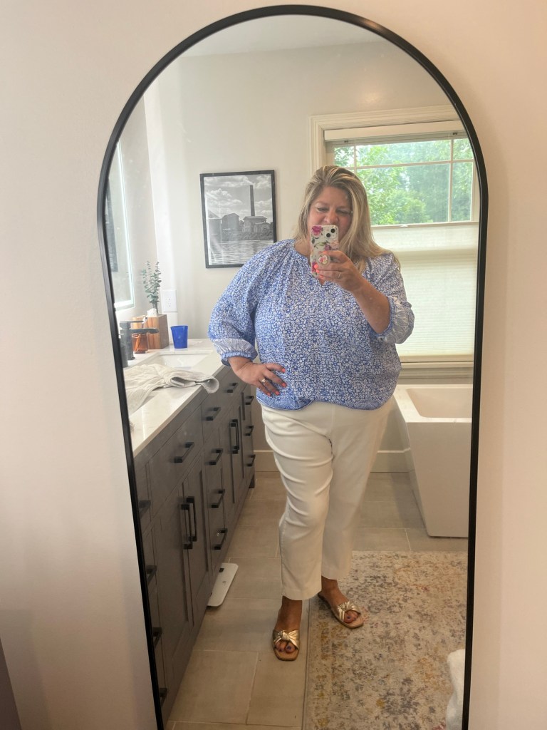 I got new Chico’s white pants at my consignment store and tried them on with the blouse, too.