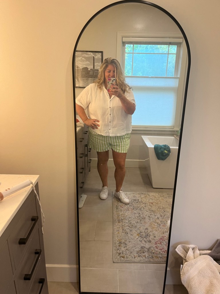 And, the second day I wore my newest Old Navy linen shorts in green and white stripe and the gauzy button up. I have on my Madewell leather sneaks that are pre-pandemic purchased in 2019, I think.