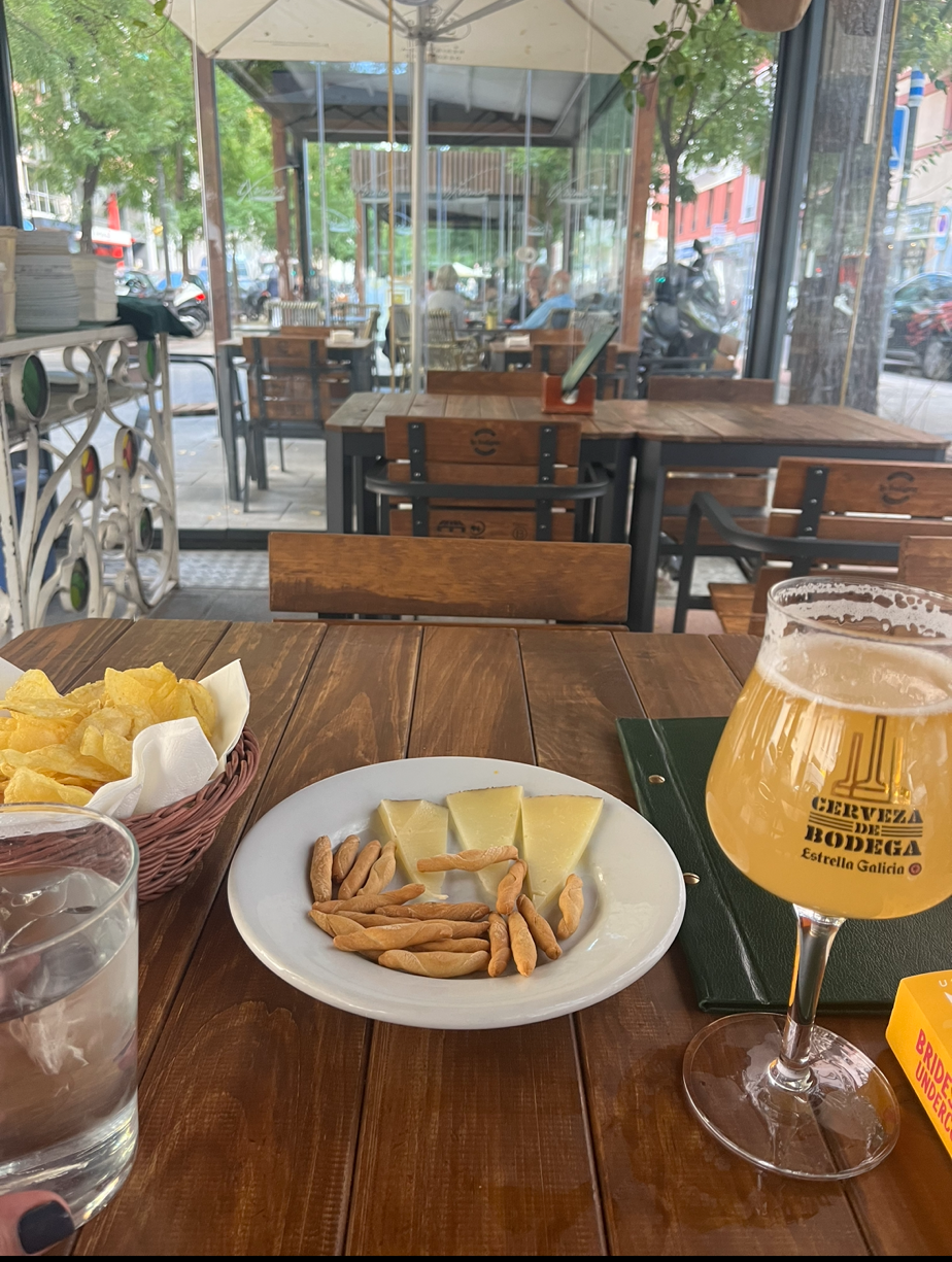 I ordered a clara (beer with lemon soda) and they brought me cheese, little baguette shaped crackers, and a bowl of potato chips all for free with your drink.
