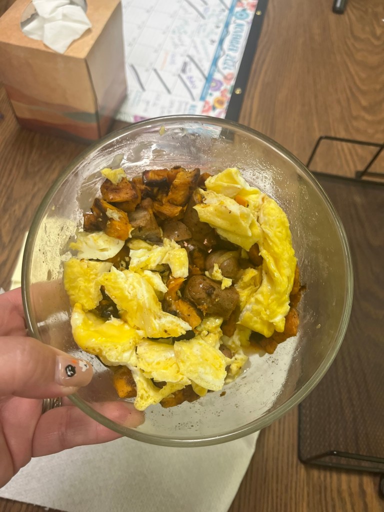 I take my breakfast to school and eat around 8:30 and this week I tried something different that turned out so yummy! I had diced and roasted sweet potatoes over the weekend as part of my meal prep and for breakfast I made a bowl with chicken sausage, egg, and a sprinkle of cheese.