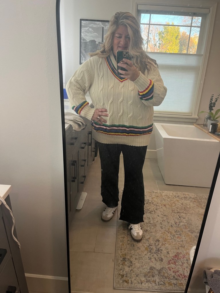 And lastly, I feel like a 50s male college cheerleader…Matilda flares with my Target sweater from last year and my Sambas – lol.