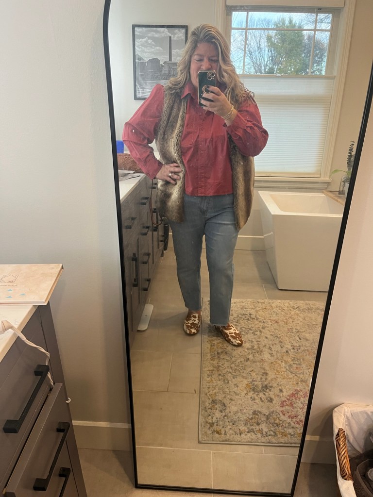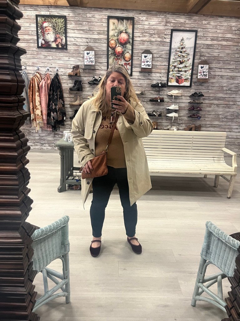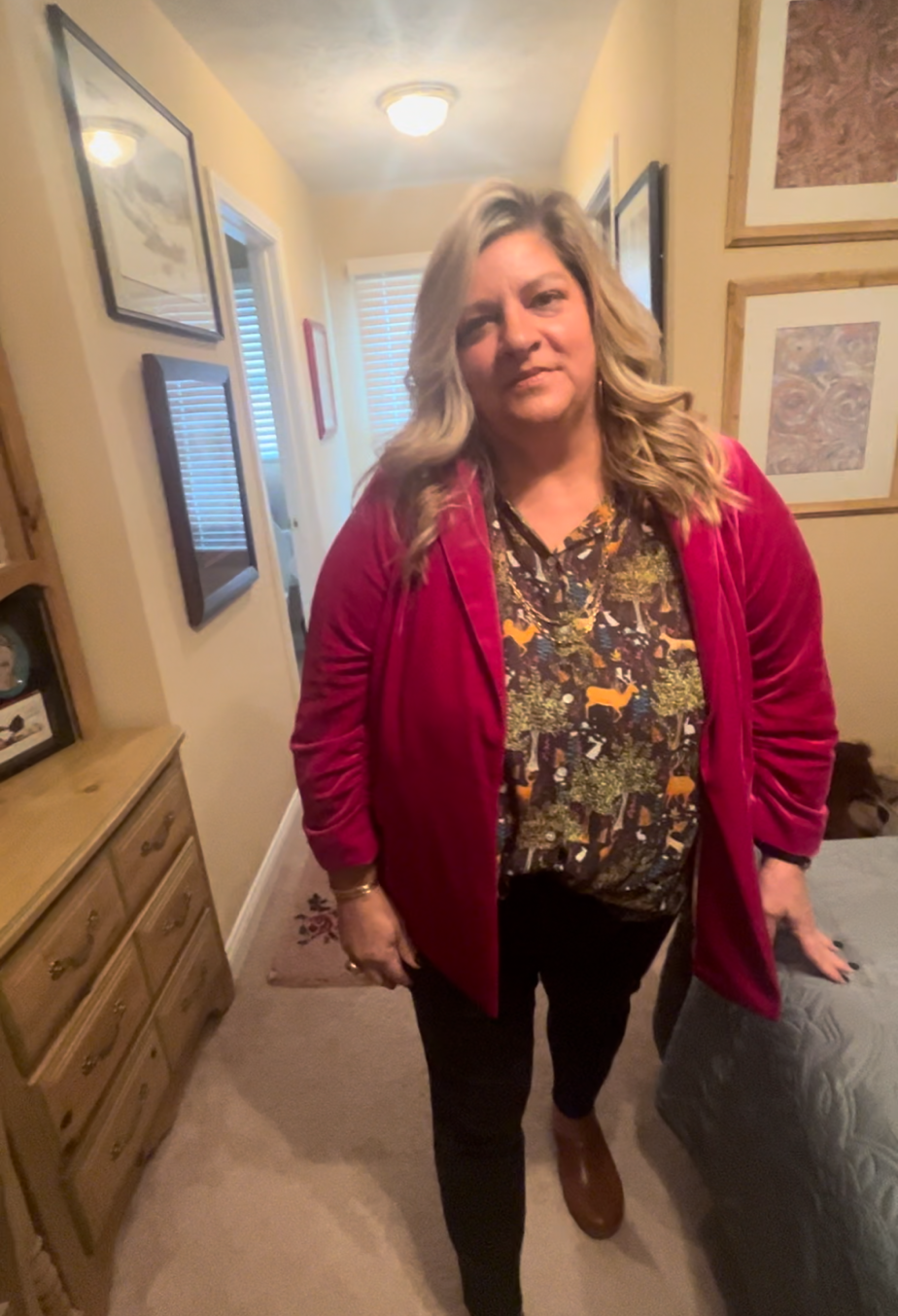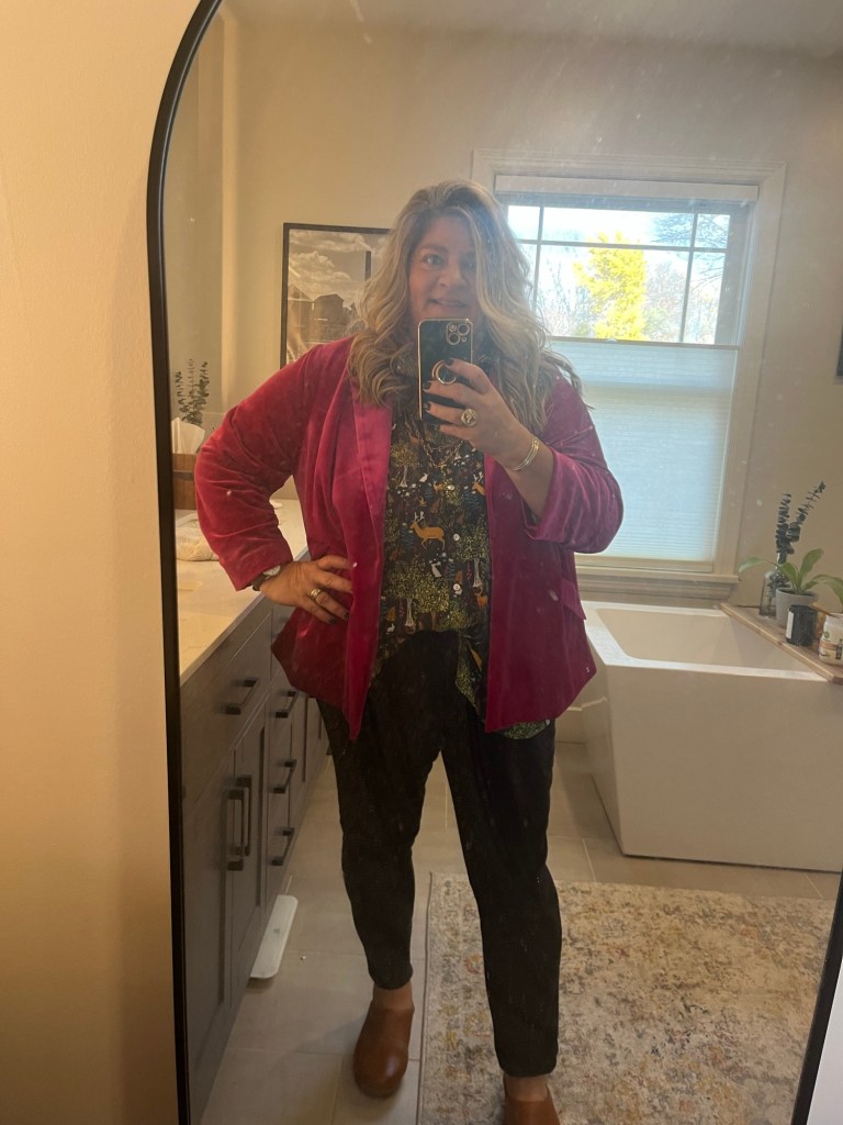 Friday for my second Thanksgiving I wore this – the black jeans again looking better with this shoe, a TJ Maxx blouse that I love, and my consignment blazer. Two of the three are consignment!