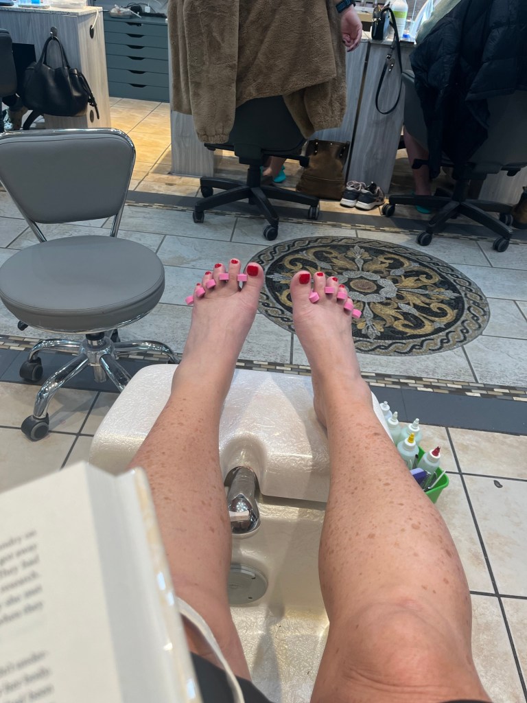 You had a very fashionable week! I love everything you wore. I think the ‘cropped’ shirts are so good with high waisted pants and look great on those of us who are short waisted. How nice that your Spain shoes are comfortable and supportive! I got a red pedi last week too!