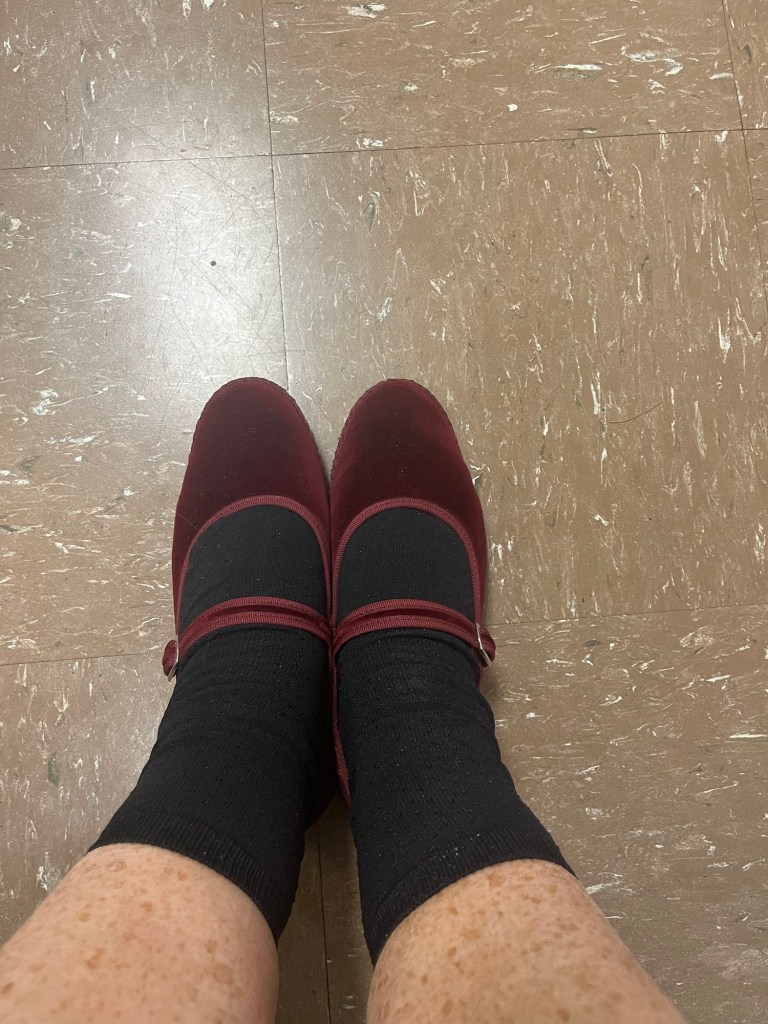 I have on my Target black silk slip skirt, a black tee, and my very, very old Amazon Burberry-esque knit cardigan and my Cayumas. I wore short rubber boots to get to school and then changed into these. They were more supportive than I thought they would be.