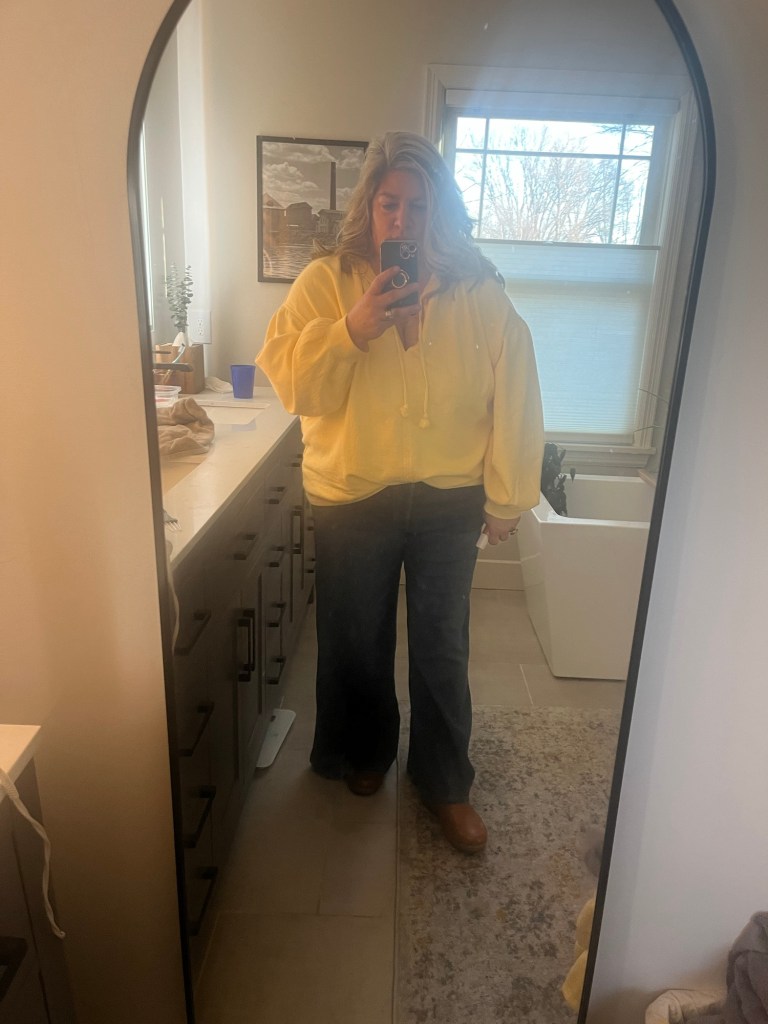 And, Thursday after school I went to Aerie. I had two things in my online cart and decided to just go in store and try on and feel the material. What a concept! Can we sing praise for in store shopping, try ons, and no returns needed? No waiting for Mr. UPS to show up? It was great. I got this butter yellow dressed up sweatshirt and immediately wore it the next day. I love yellow!