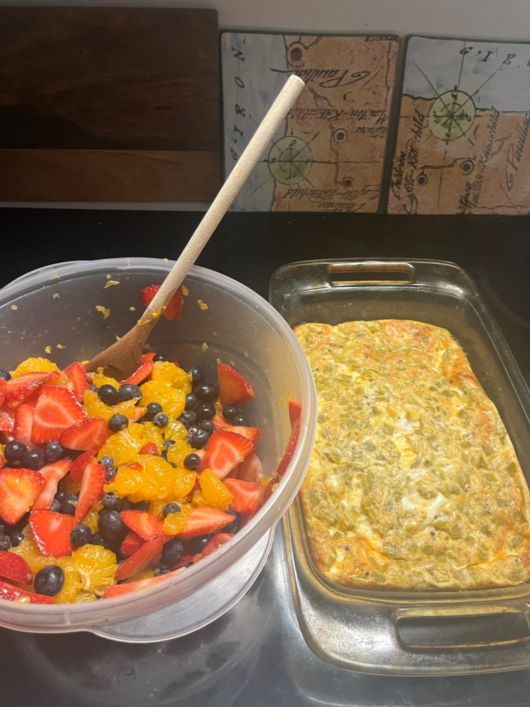 I woke up Saturday after not enough hours of sleep and made fruit salad (copycat Chick Fil A, I think – you do two cans of mandarin oranges drained, a container of blueberries, and a container of strawberries sliced up – then you sprinkle about a tablespoon of vanilla pudding powder and about 1/4 cup of lime juice) and a low carb egg casserole.